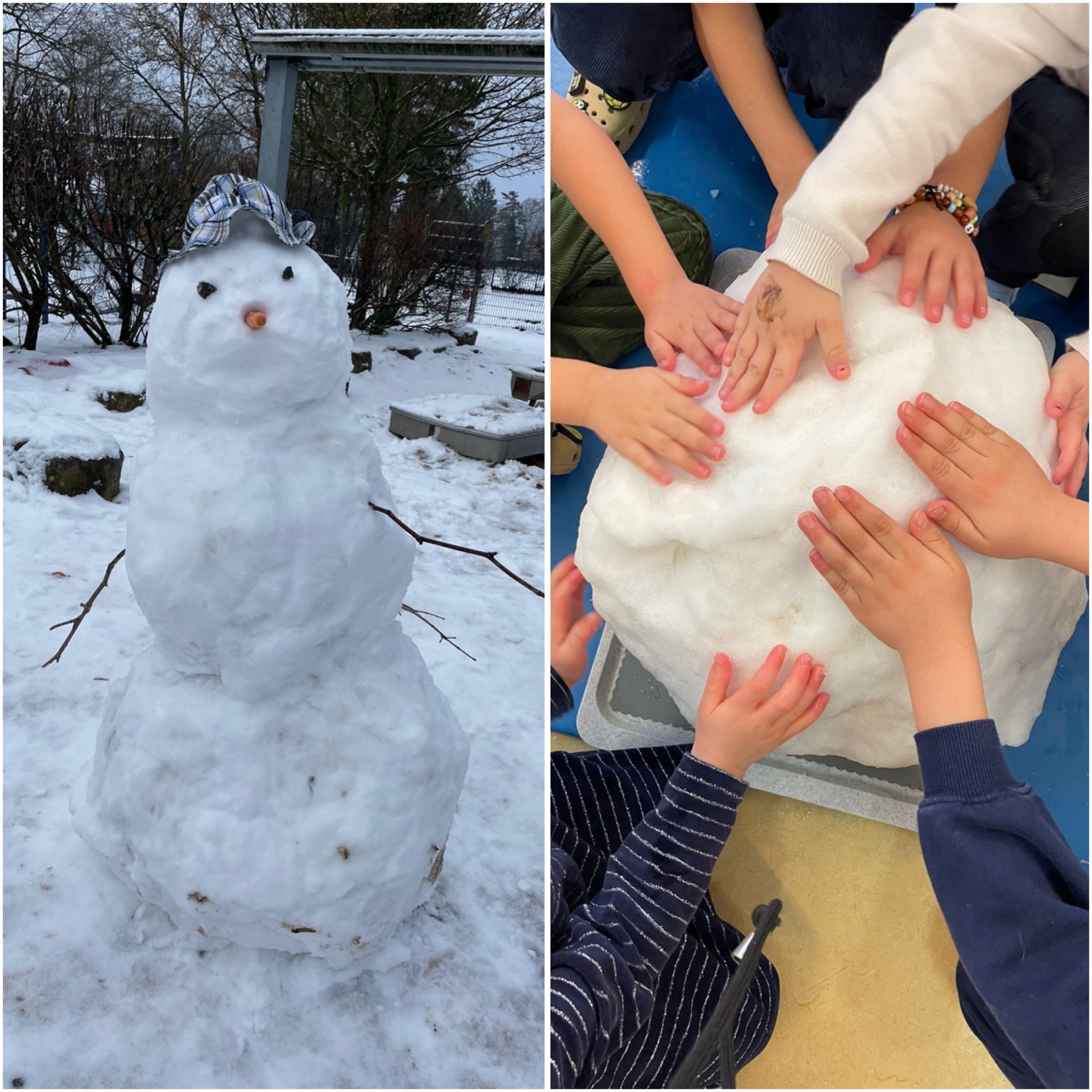 Und dann haben wir etwas Schnee mit in die Gruppe genommen zum anfassen und beobachten, wie lange der Schnee braucht bis er geschmolzen ist.